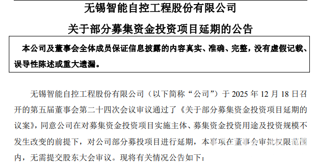【儀表網(wǎng) 企業(yè)動態(tài)】12月19日,智能自控(002877)發(fā)布公告,公司第五屆董事會第二十四次會議審議通過了《關(guān)于部分募集資金投資項目延期的議案》,同意將“開關(guān)控制閥制造基地項目”達(dá)到預(yù)定可使用狀態(tài)的日期從2025年12月31日延期至2026年12月31日。